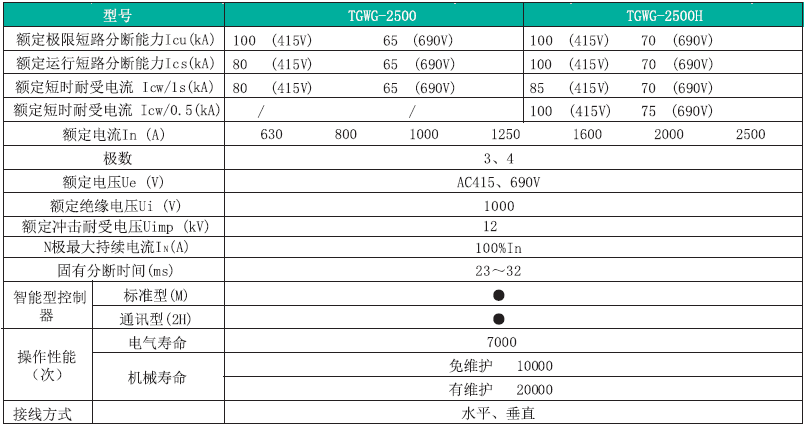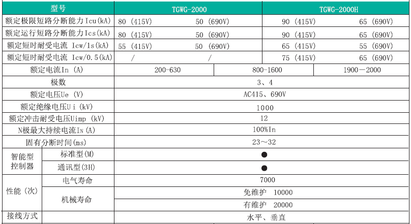 TGWG 系列万能式断路器,适用于交流50Hz,额定电压AC380V~AC690V,额定电流200A~6300A 的配电网络中,用来分配电能和保护线路及电源设备免受过载、短路、欠电压、单相接地或剩余电流等故障的危害。该断路器具有可通信及智能化保护功能,能提高供电可靠性,避免不必要的停电。